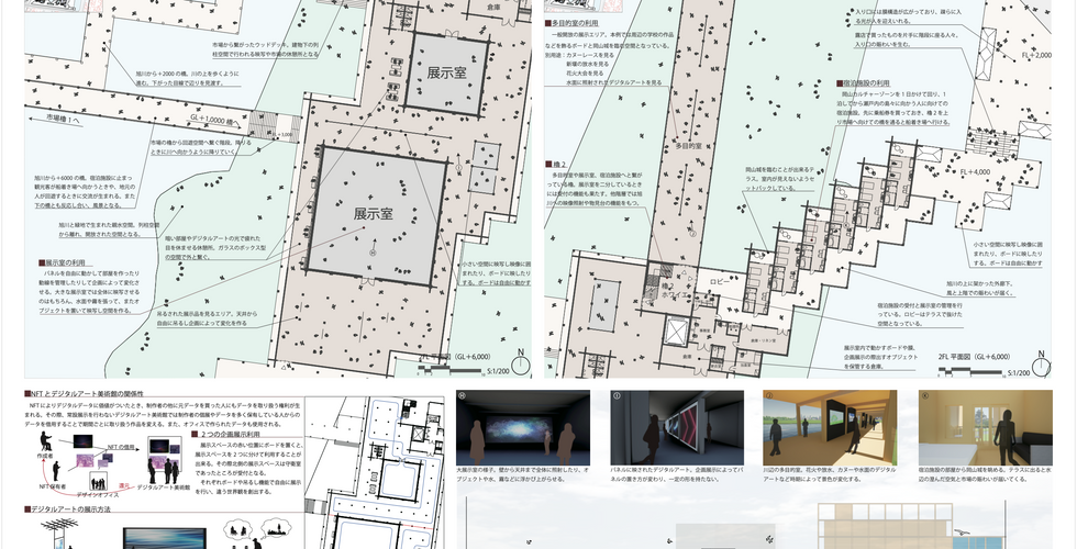 そこで、現在のカルチャーゾーンに存在しないデジタルアートに重きを置いた文化複合施設を計画し、岡山カルチャーゾーンの更なる回遊行動を促すことを本計画の目的とした。櫓構造・膜構造・水運・デジタルアートなどを要素に繋ぐことで、周辺地域に活気のある営みを取り戻す。